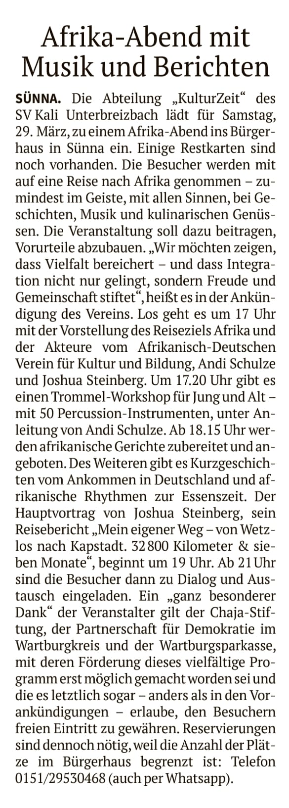 Die Veranstaltung kann Dank erhaltener Förderungen von der Chaja Stiftung, der Partnerschaft für Demokratie im Wartburgkreis im Rahmen des Bundesprogramms "Demokratie leben!" und des Thüringer Landesprogramms DENK BUNT sowie der Wartburg Sparkasse allen Interessierten mit freiem Eintritt zugänglich gemacht werden. Das Abendprogramm wurde dadurch vielfältig erweitert, so dass der Reisebericht eingebettet in einem Afrika Abend stattfindet.