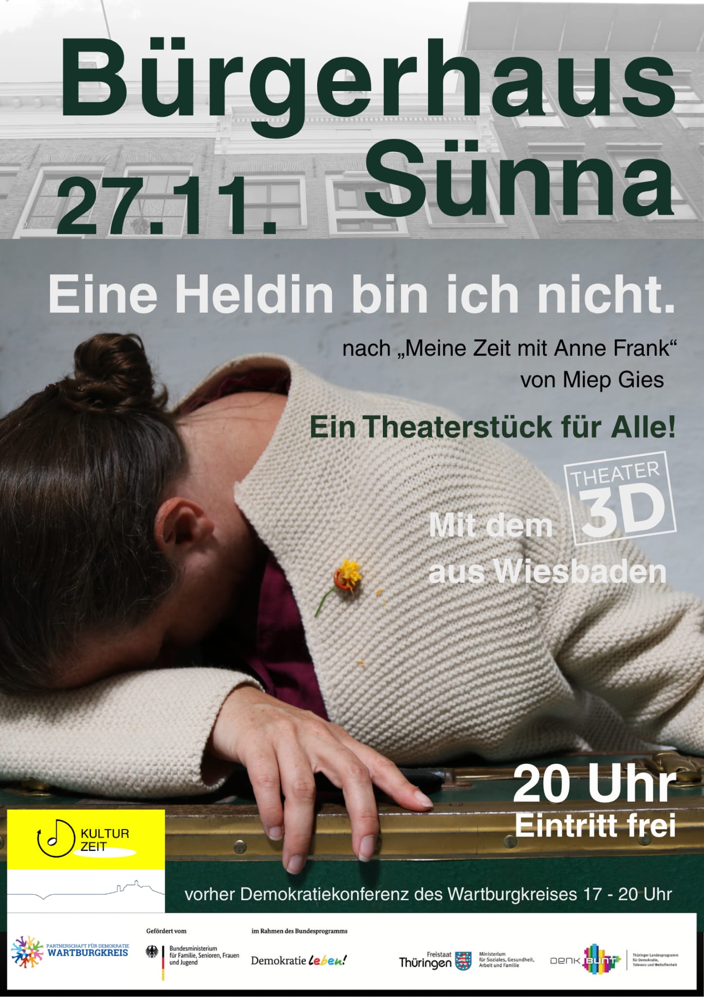 Am 27. November 2025 erwartet Sie im Anschluss an die Demokratiekonferenz des Wartburgkreises ein besonderes Theatererlebnis: Die fesselnde Inszenierung „Eine Heldin bin ich nicht“. Um 20 Uhr wird das Wiesbadener Theater 3D im Bürgerhaus Sünna die bewegende Biographie von Miep Gies zum Leben erwecken – einer mutigen Frau, die zur Zeit des Zweiten Weltkriegs Zivilcourage zeigte und Anne Frank sowie ihrer Familie half, unterzutauchen.